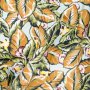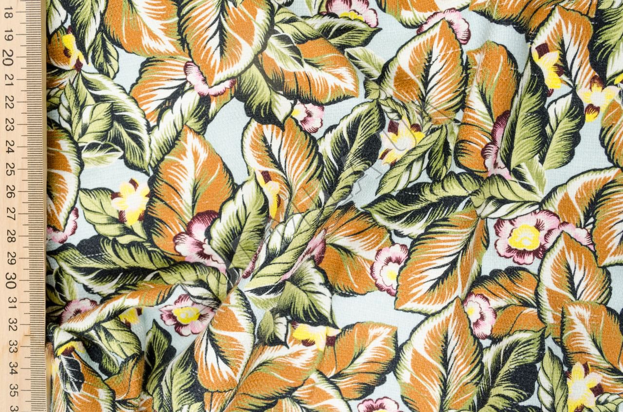 Плотный коттон, неэластичный, непрозрачный. Ткань матовая, фактурная, мягкая, приятная на ощупь.;Применение: ткань для костюмов, платьев, юбок.Цвет: оттенки красного, зеленого, желтого, светло-коричневый на голубом фоне.Плотность: 260 гр/м2.;