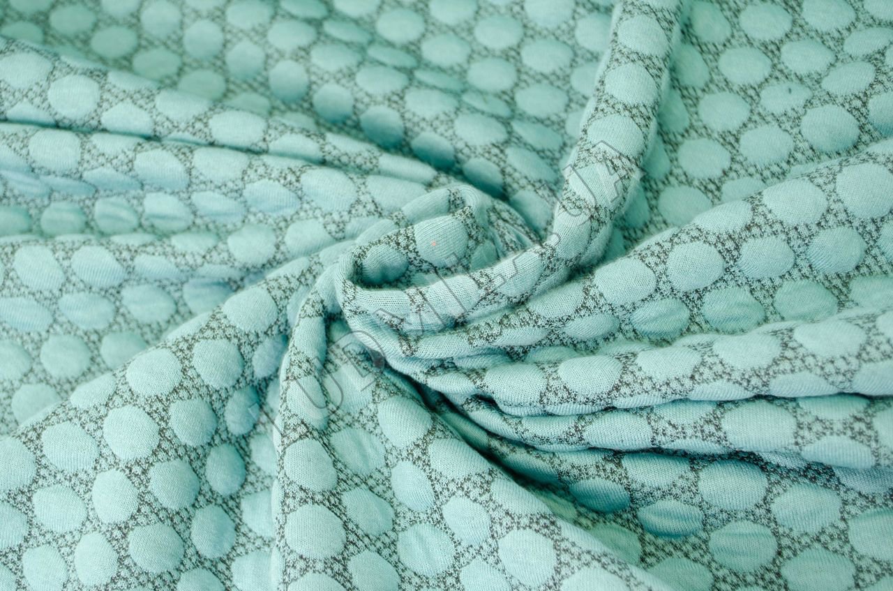 Фактурнй трикотаж, эластичный, непрозрачный. Ткань мягкая, плотная, приятная на ощупь. Размер фактурных кругов - 1,5 см.;Применние: ткань для легких пальто, кардиганов, платьев.Цвет: морская волная, черный.;