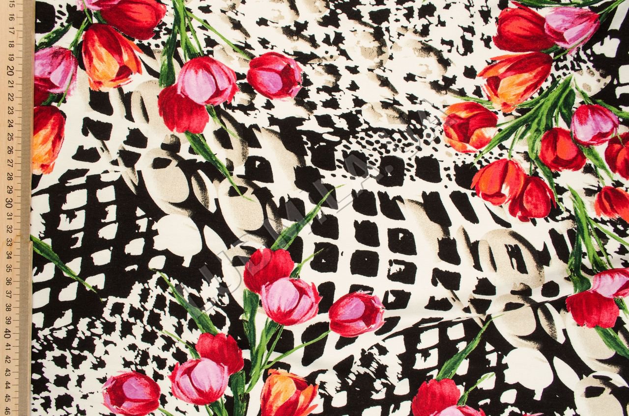 Трикотаж средней плотности, эластичный, непрозрачный. Ткань гладкая, мягкая, хорошо драпируется, приятная на ощупь.Применение: ткань для кофт, маек, футболок.Цвет: оттенки красного, зеленого, светло-коричневый, черный на молочном фоне.Плотность: 210 гр/м2.;