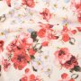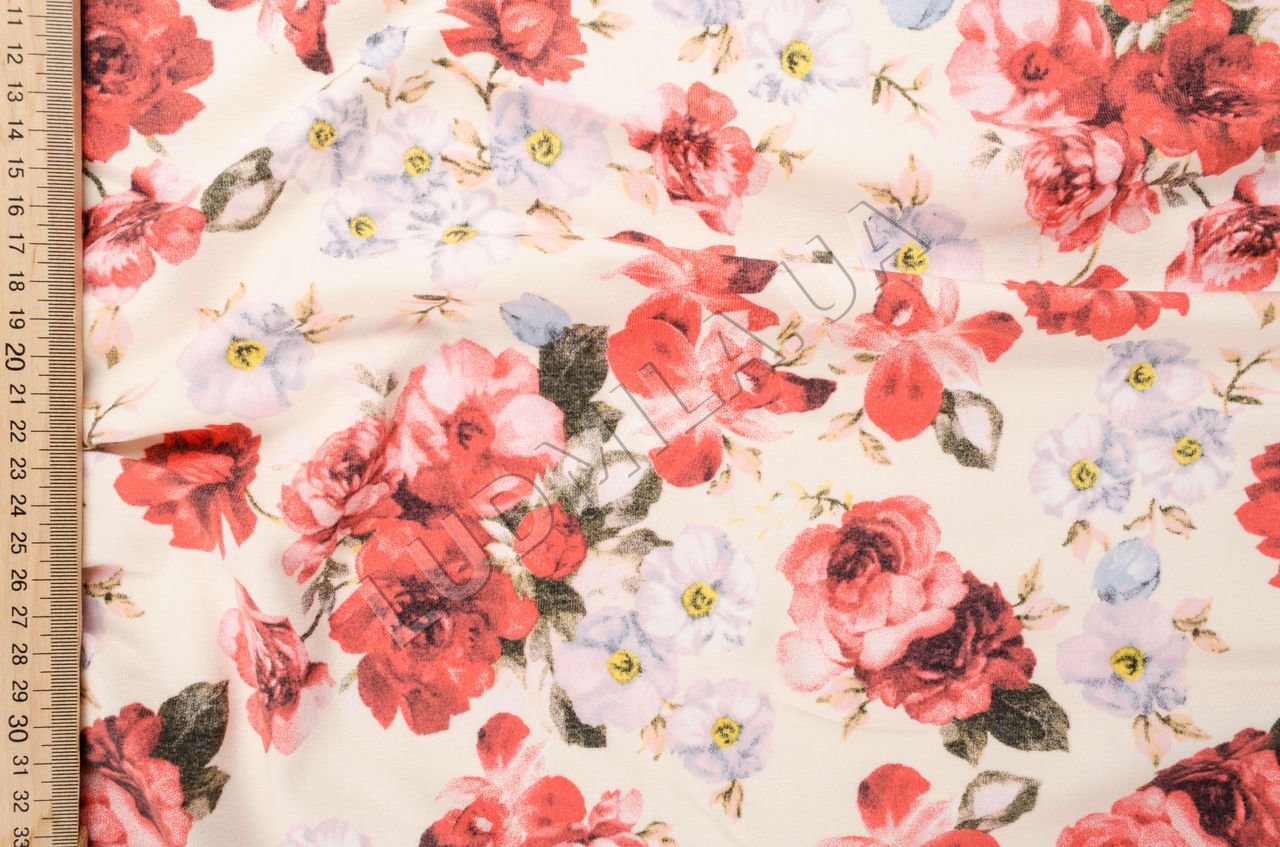 Трикотаж средней плотности, эластичный, непрозрачный. Ткань мягкая, гладкая, матовая.Применение: ткань для пуловеров, кардиганов, футболок.Цвет: оттенки красного, зеленого на бледно-желтом фоне.Плотность: 155 гр/м2.